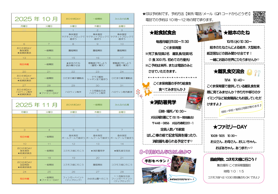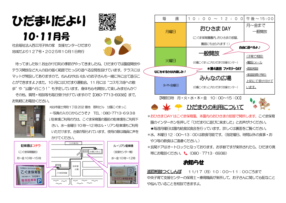*10・11月号 ひだまりだより* 2025年9月19日 ひだまりのお知らせ こんにちは。新しいおたよりができました。外遊びも心地良い季節がやってきそうですね!園庭やテラス、戸外遊びも一緒に楽しみませんか?来所お待ちしていますね♪