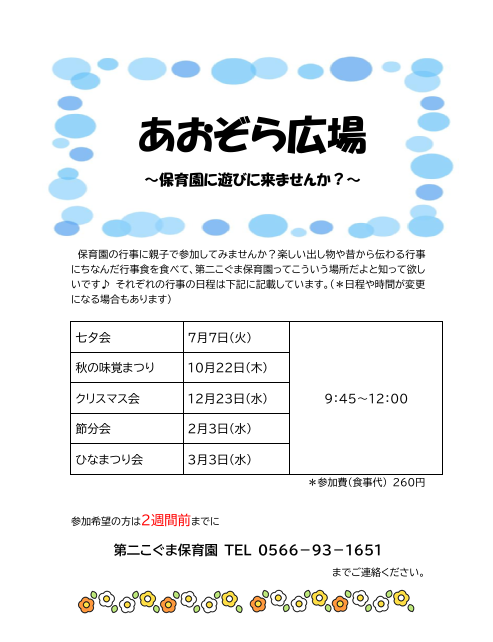 お預かりができません。尚、保育中に体調が悪くなったり、暴風警報が発令された時など